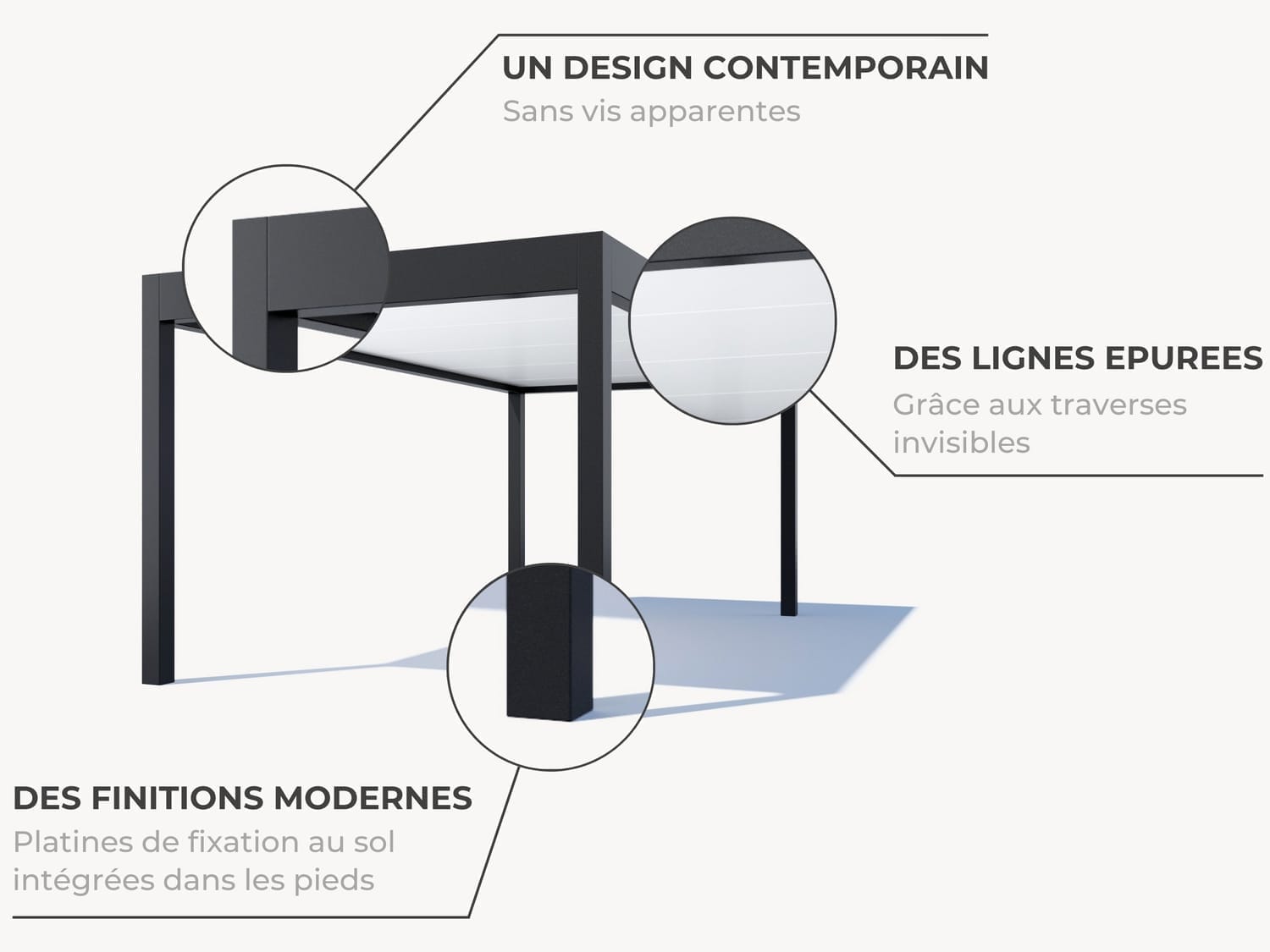 Design : grâce à notre conception sans vis et fixations au sol apparentes et un toit sans polycarbonate grâce à notre structure 100% aluminium et toiture en acier isolé.